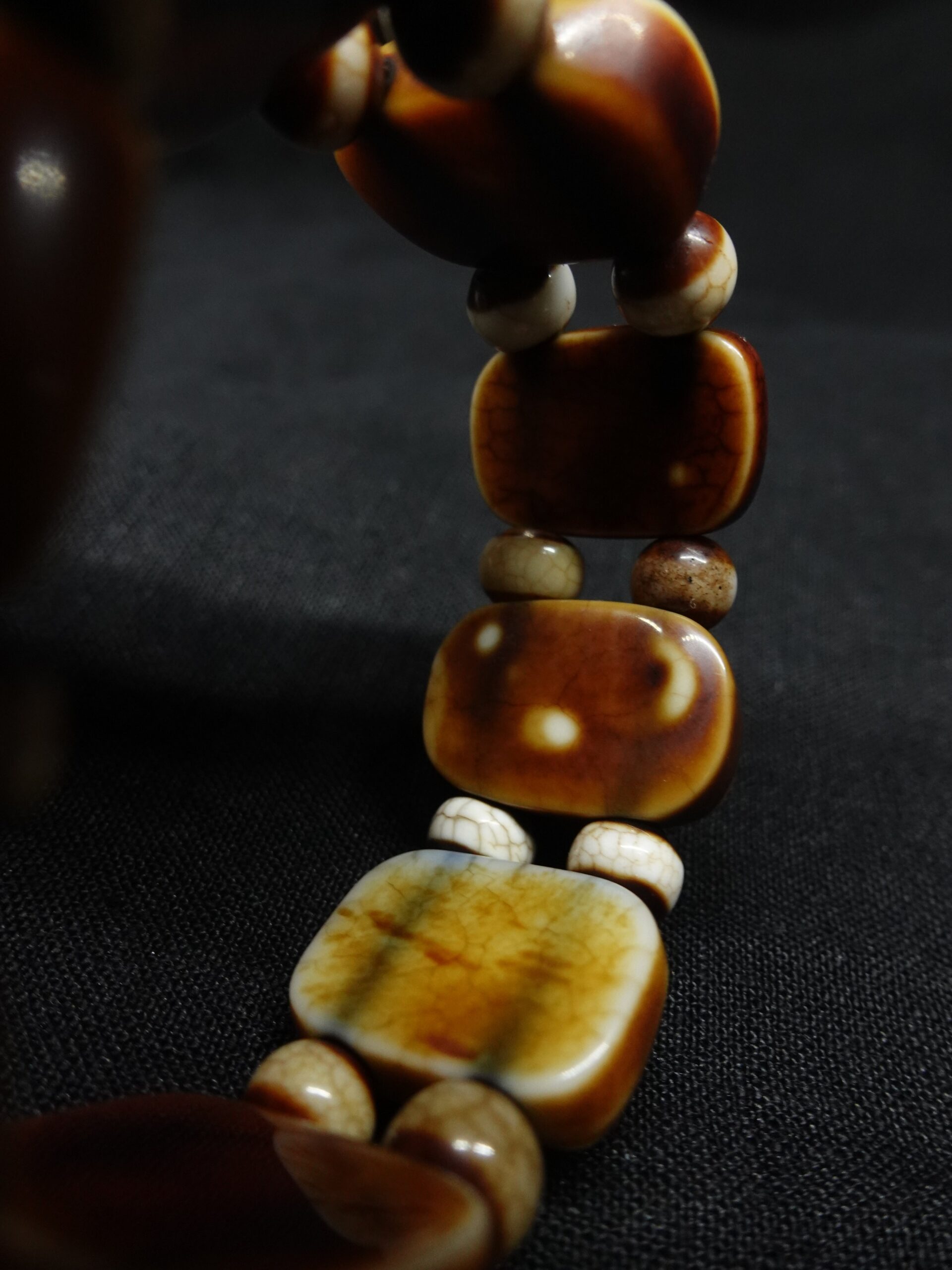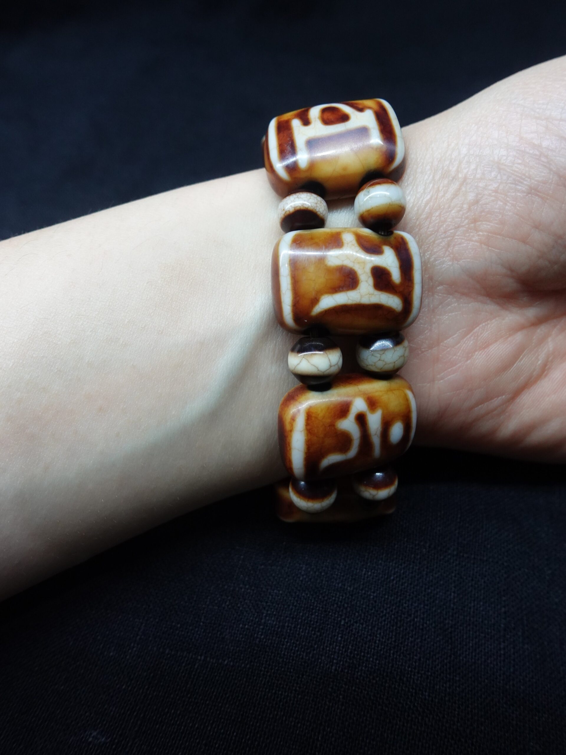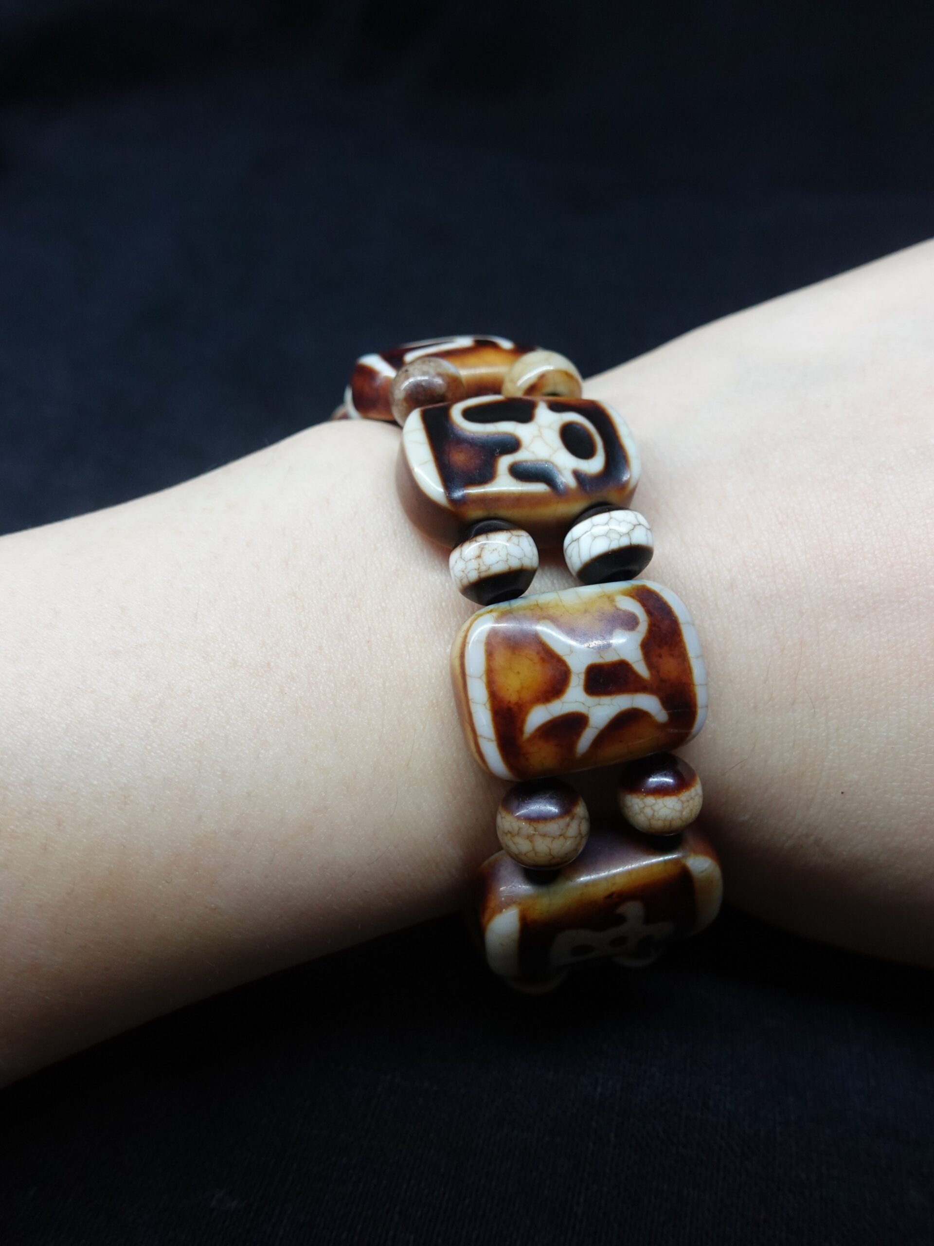 Design: This bracelet features beads engraved with mantras of Guanyin and the God of Wealth.