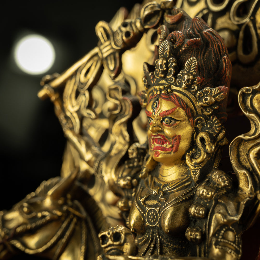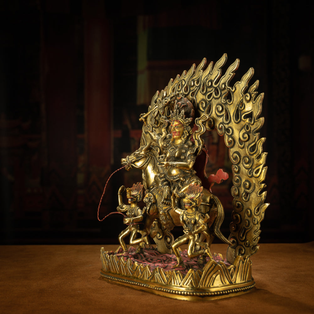 Golden Mahakala Goddess with Sacred Horse Statue for Protection & Strength