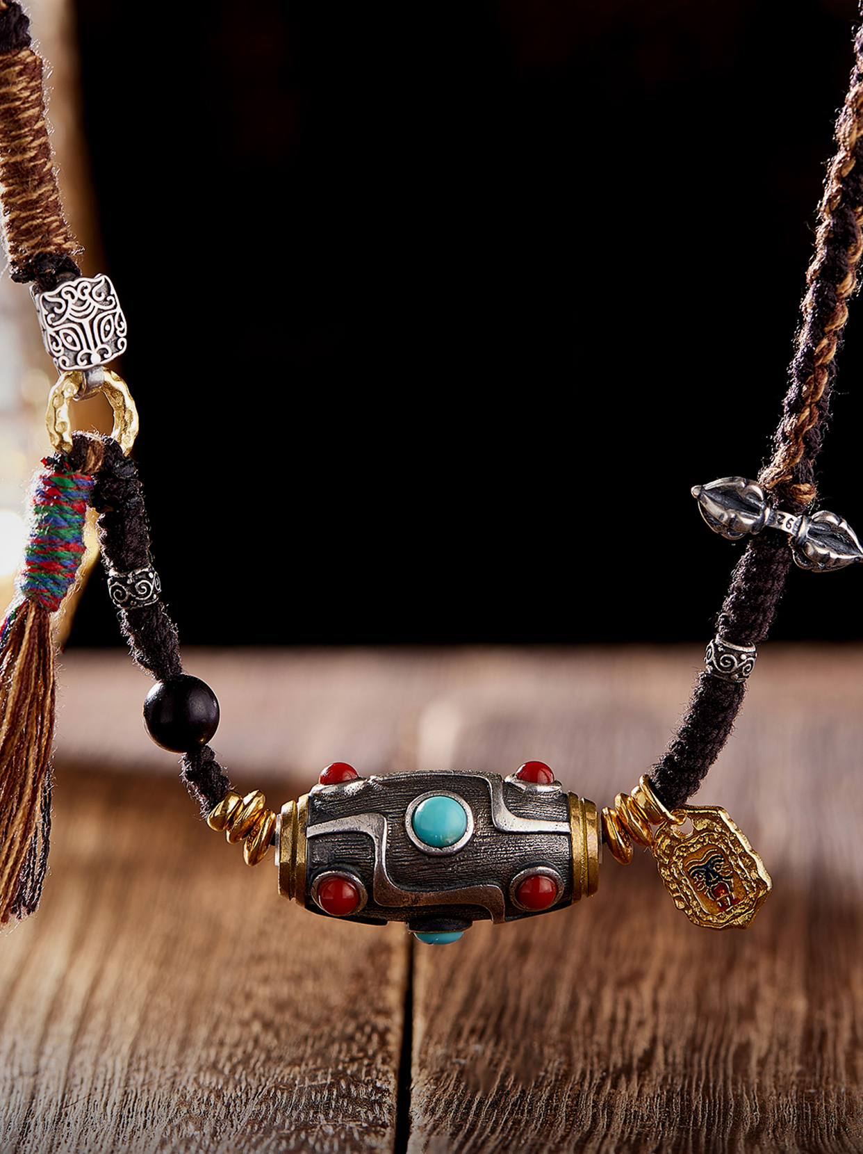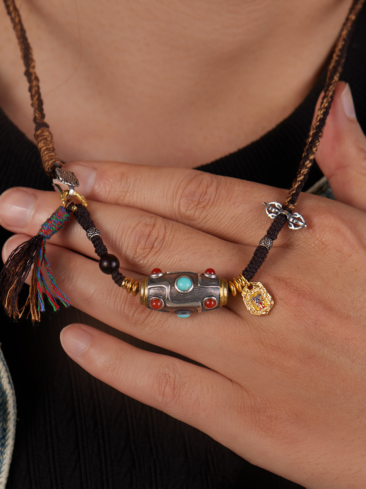 Design: This pendant features a Himalayan style woven cord technique. incorporating a variety of precious elements. including a Zakirum charm. Vajra. turquoise. and agate. with the Nine-Eye Dzi bead as the central stone.