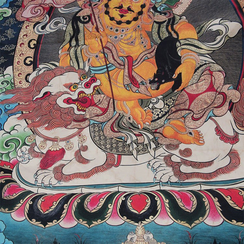 This thangka is a treasure dharma image. with a classic style layout. full but not overflowing. with appropriate density. and the main deity is very prominent. The treasure in this thangka is wearing a crown. a high bun. and earrings hanging from the shoulders; the face is square. the eyebrows are slightly furrowed. the eyes are bright. and the expression is majestic and calm; the gorgeous victory banner stands in front of him. symbolizing his ability to It brings wealth and satisfaction to people. as well as the indispensable rain and dew moisture in good weather; the left hand holds the treasure-spitting rat. and the treasure-spitting rat is continuously spitting out pearls in the offering bowl below; the body is tall and strong. and the sitting posture is powerful in the three realms. Riding on a white lion. the lion looks back and roars. its eyes are like torches. and it is powerful and powerful. Smooth lines and meticulous painting techniques create a mysterious. tranquil and serene atmosphere. The meaning is mysterious and deep. making people feel peace and tranquility from the heart when appreciating this thangka. which shows the artist’s superb skills. artistic level. The painting and coloring are typical Mian Tang style thangka style. the painting layout is regular. the painting is exquisite and artistic. The thick mineral pigments of the New Mian Tang School are carefully painted. giving people a powerful and deterrent aesthetic effect.