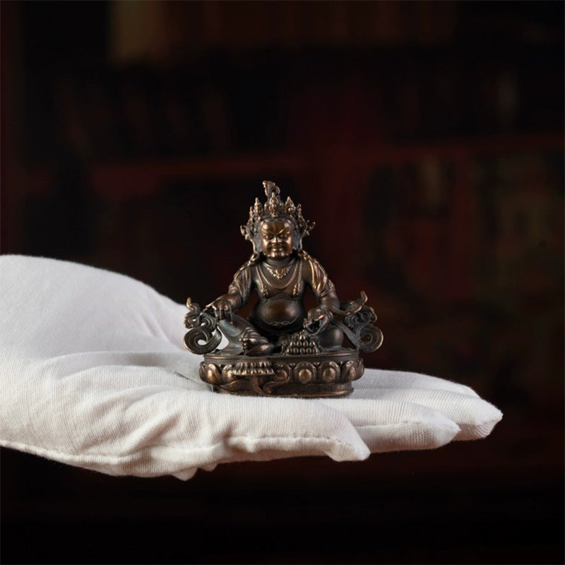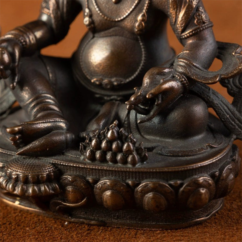 Tashi Lhunpo Monastery. located in Shigatse City. Tibet Autonomous Region today. was built in 1447. Tashi Lhunpo Monastery is also a center of Tibetan art. It is one of the sculpture art schools in Tibet. It reached its peak in the 17th century and its influence still exists today. This statue of the Yellow Jambhala is small in size and is a portable Buddha. The Yellow Jambhala wears a five-leaf corolla. a gourd-shaped bun on top of his head. and the top of the bun is decorated with branches. The remaining hair is braided and hangs down on both shoulders. There are crown knots and drooping rings on the ears. The face is plump and round. with a flat nose and wide mouth. The eyebrows are upturned in an inverted figure eight shape. and the eyes are round. The face seems a little sullen. but it also reveals calmness and majesty. The body is obese. the lower abdomen is round. and the limbs are short and thick. The upper body is naked. only covered with light silk fabrics. and decorated with necklaces and necklaces. The ribbons are placed on both sides of the arms. floating up like flames to set off the luxurious aura of the Yellow Jambhala. The left hand is gently caressing the treasure-vomiting rat on the knee. The official name of this beast is the weasel. Legend has it that it is a spiritual beast that swallows treasures. After being subdued by the Yellow Jambhala. it became his assistant in giving money. The right hand holds a peach-shaped orb. The rosette part is even more outstanding. and the lotus petals are the high relief of the crown. There is an original base plate at the bottom. and the cross diamond in the middle firmly protects the internal decoration. Although this is a portable Buddha. it feels heavy and well preserved. Yellow Jambhala are not uncommon. but the inch Buddha is rare. The details of this statue are full of the Tashi Lhunpo style. and it is a must-see for collectors.